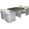 A stylish set of patio furniture made from high quality polyethylene wicker and featuring seat and back cushions for complete comfort. This 4 seater cube set includes a 120cm square table with a full woven table top and 5mm UV transparent glass and four curved chairs which slide neatly under the table for convenient storage. Dimensions: Table: H73 x W110 x D110cm; Chair H87 x W60 x D57cm.