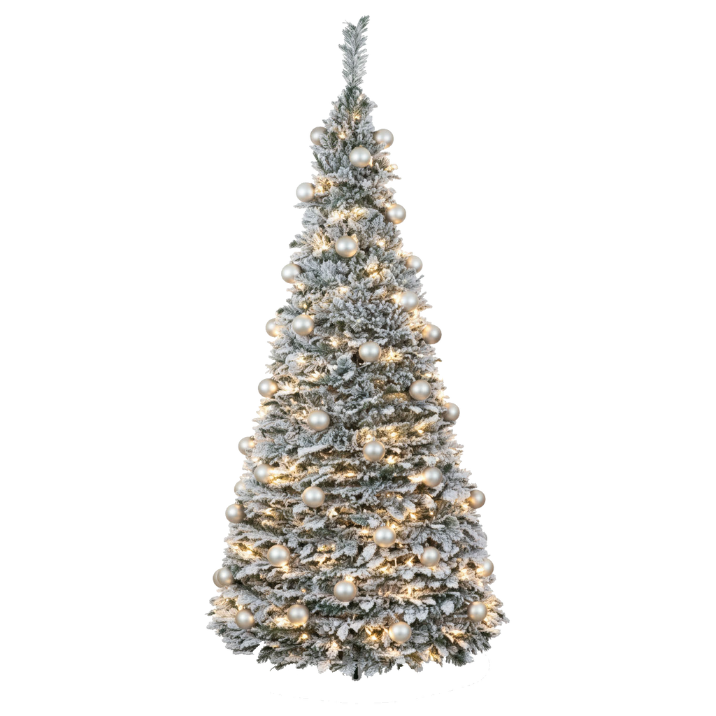 This Holly Flock Pop-Up Pre-Lit Tree - 6ft is simple and easy to assemble - its ingenious pop-up design means it can be set up and taken down in seconds! This tree features 130 warm white multi-action LED lights hidden in the branches with an 8 setting controller with timer function. It comes pre-decorated with a snowy finish for a winter wonderland look. This tree is mains operated with a cable length of 5m and comes with a sturdy folding tree stand.