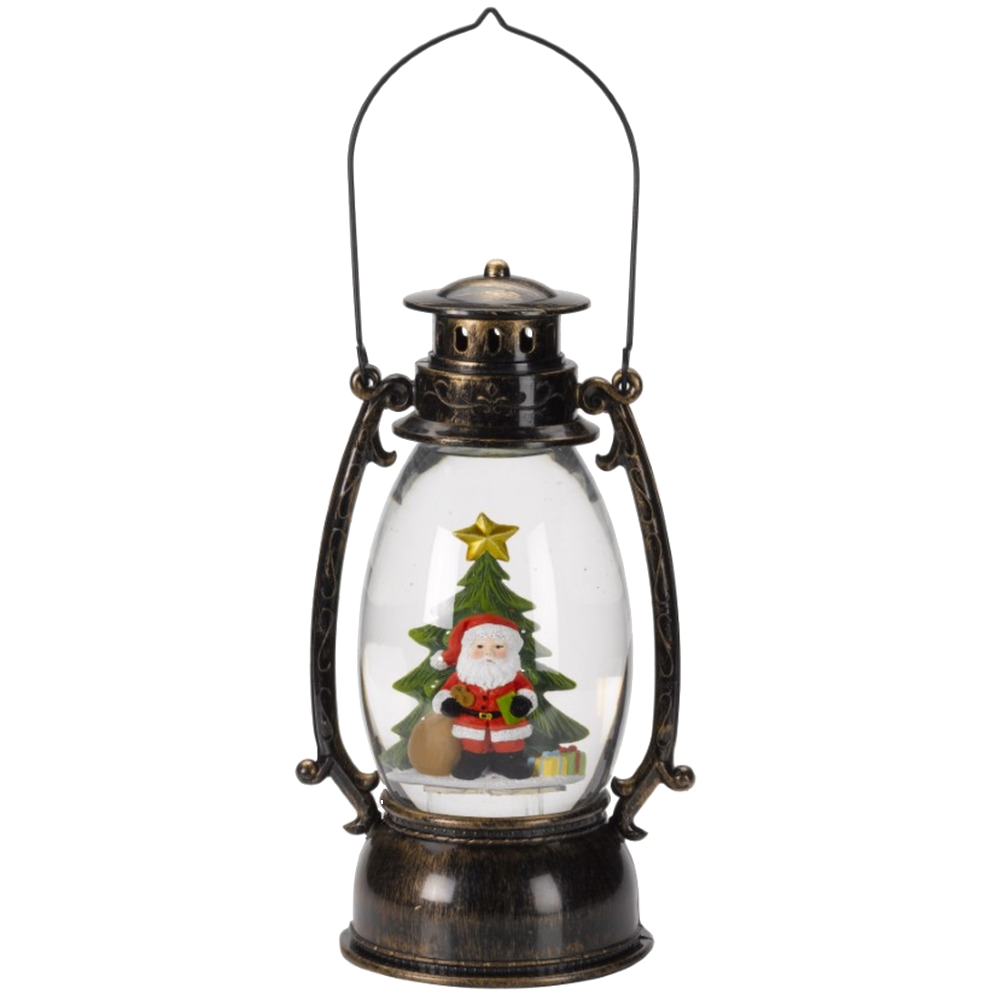 Bring the beauty of winter indoors with this Snow Swirl Santa Tree Lantern filled with water and packed full of glitter for the ultimate Christmas sparkle. Featuring warm white LED lights and a black and copper brush-effect finish, this lantern is powered by 3 AA batteries and equipped with a timer for ease of use.