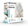 The Daewood 9-inch Desk Fan features 2 speed settings, an oscillating function for wider distribution to ensure that this portable desk fan really hits the spot. Fitted with an easy-to-use key switch system, this desktop fan is simple to operate. It also features triple blades to produce powerful airflow that helps you stay focussed at your desk. Ideal for homeworking. 3 year warranty