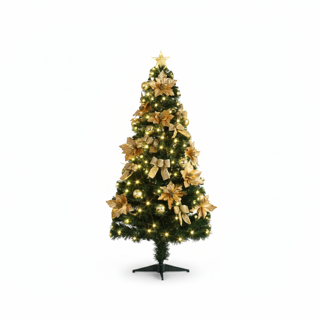 The Fibre Optic Gold Poinsettia and Bow Tree - 1.2m is beautifully adorned with festive decorations and features white to warm white colour changing LEDs with a 13 setting multi-action controller. Easy to assemble with a metal tree stand included. The tree is suitable for indoor use only.
